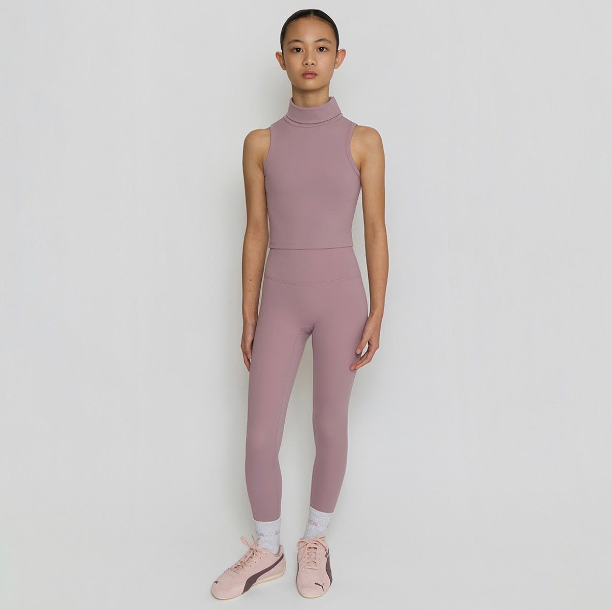 The Blanca Sport Girls Mauve Leggings Set is designed for active girls, featuring high-waisted leggings and a mid-length turtleneck top. Constructed from a blend of 70% nylon and 30% spandex, this set provides a compressive fit and buttery soft texture, ensuring comfort and support for daily activities.