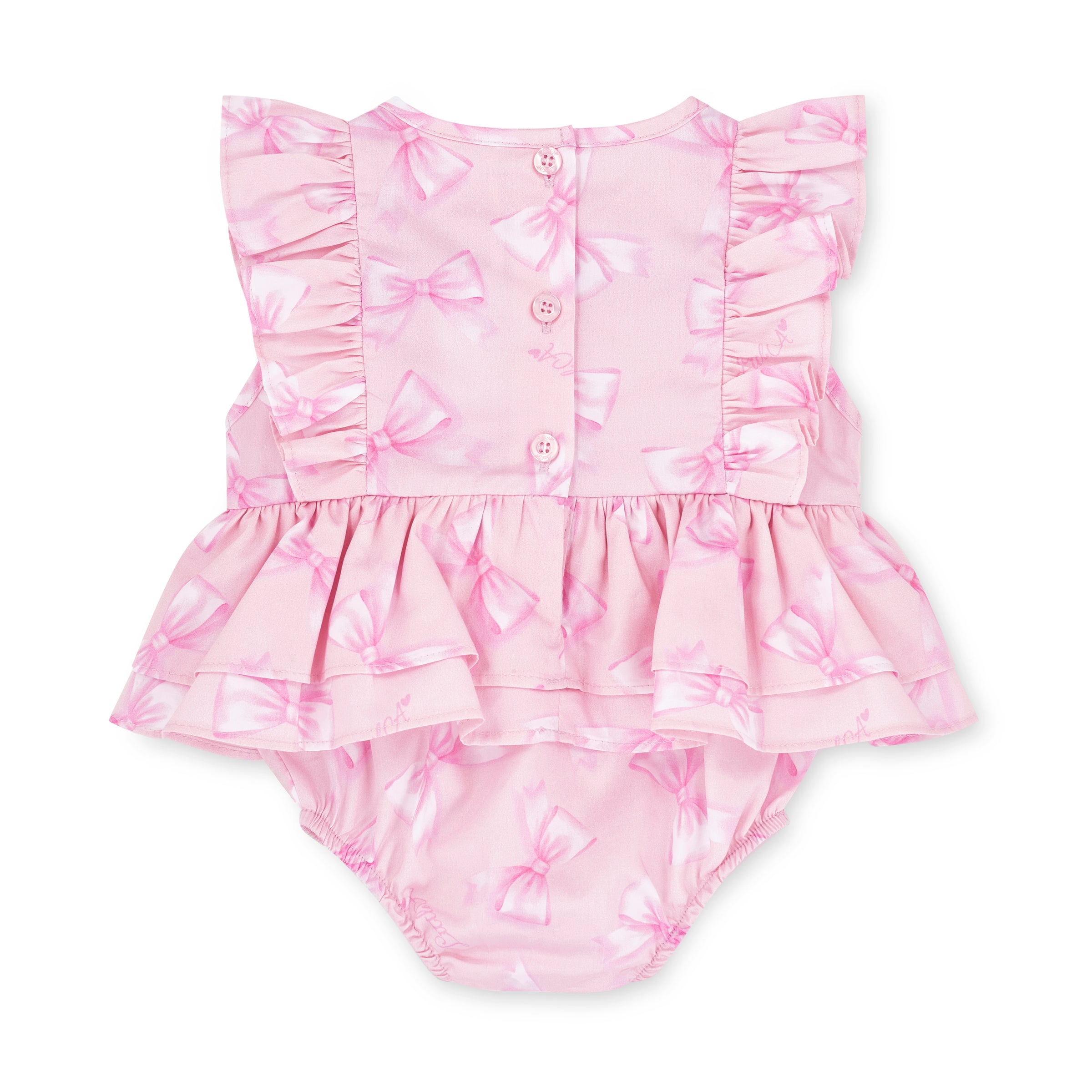 Adorable bow print romper bursting with charm and personality! This delightful piece features an all-over bow print design, complemented by a pretty frilled trim and decorative bow detail. The standout diamante 'A' embellishment on the front adds a touch of sparkle and sophistication. Perfect for special occasions or everyday cuteness, this romper combines comfort with eye-catching style that little ones will love wearing.