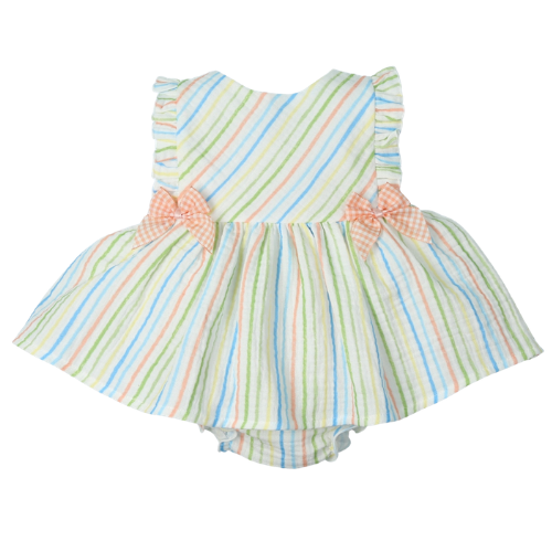 Adorable lime stripe dress featuring a charming bow detail at the front, paired with matching bloomers for a complete look. Crafted from soft cotton, this two-piece set is perfect for little ones who love colour and style. The classic stripe pattern keeps things fresh and fun, while the bloomers provide comfort and coverage underneath. Ideal for playdates, special occasions, or everyday wear that makes getting dressed an adventure!